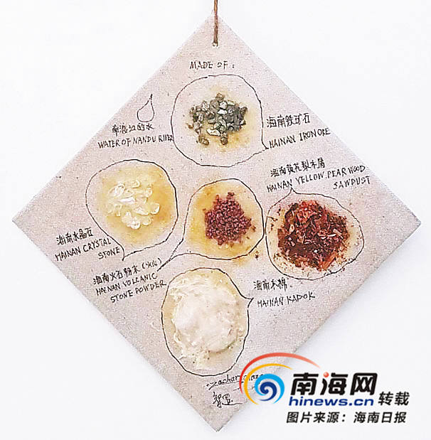 作為張智罡的第二故鄉(xiāng),海南經(jīng)常會(huì)在不經(jīng)意間給予藝術(shù)家新的思考和藝術(shù)的靈感,本次雙年展展出的《聚散的五行》就是以海南石碌的鐵礦石、昌江的木棉、屯昌的水晶、五指山的黃花梨木屑、火山口的火山石粉末等帶有海南本土地域特征的材料,制作而成一幅表現(xiàn)海南印象的抽象作品,在威尼斯雙年展發(fā)出海南藝術(shù)之聲。