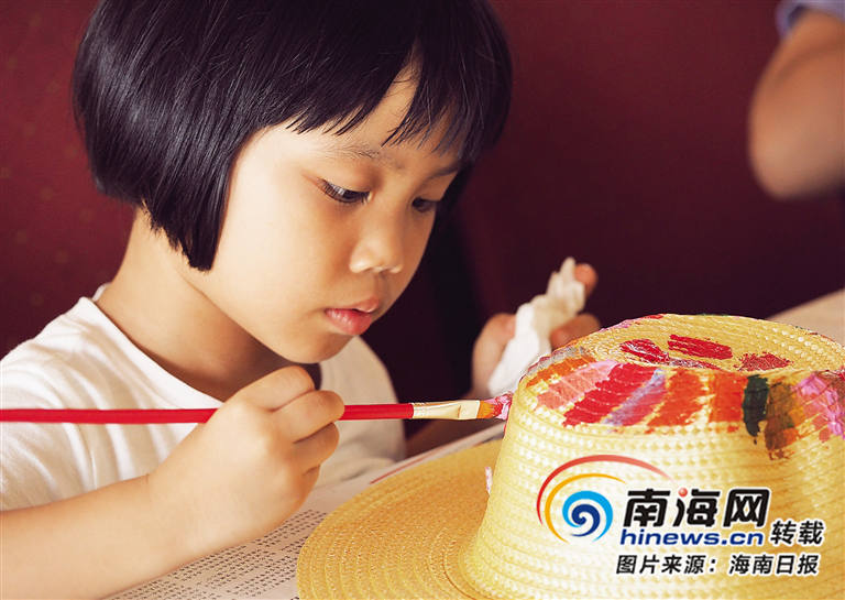 在親子游活動中,一位小朋友在為草帽上色。見習記者 封爍 攝