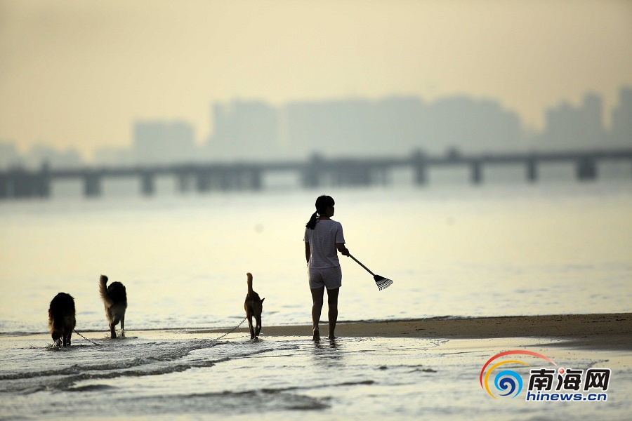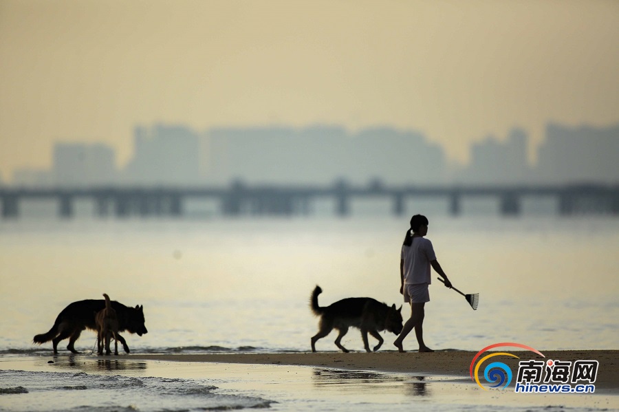 海南旅游頭條、南海網、南海網客戶端海口7月11日消息(海報集團全媒體中心記者 陳元才)7月11日,在海口西海岸,清晨的海面上太陽初升,朝霞滿天,海灘上市民遛狗休閑,游客賞海,組成一幅幅靚麗的風景畫。