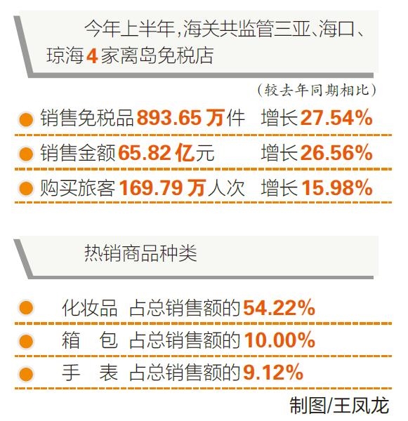 海南日?qǐng)?bào)海口7月13日訊 (記者梁振君 特約記者張振豪 通訊員郭建盟 范平勛)海南離島免稅銷售再創(chuàng)新高。據(jù)海口海關(guān)7月13日初步統(tǒng)計(jì),2019年上半年,海關(guān)共監(jiān)管三亞、海口、瓊海4家離島免稅店銷售免稅品893.65萬(wàn)件、銷售金額65.82億元、購(gòu)買(mǎi)旅客169.79萬(wàn)人次,較去年同期相比(下同)均有增長(zhǎng)。