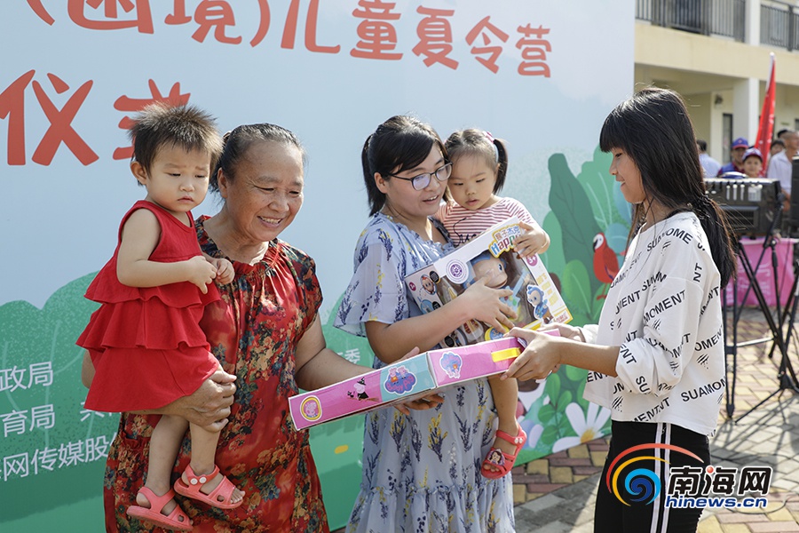 參營(yíng)兒童代表向瓊海市福利院小朋友贈(zèng)送禮物。南海網(wǎng)記者 李昊 攝
