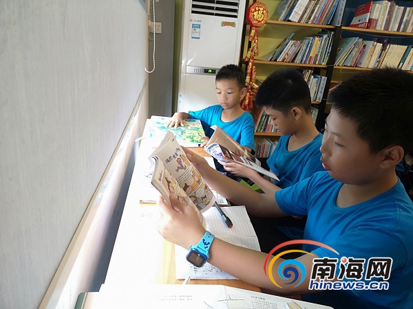 孩子們?cè)诤?谌嗣耱T兵營(yíng)的圖書室內(nèi)瀏覽圖書。南海網(wǎng)記者 蘇靚 攝