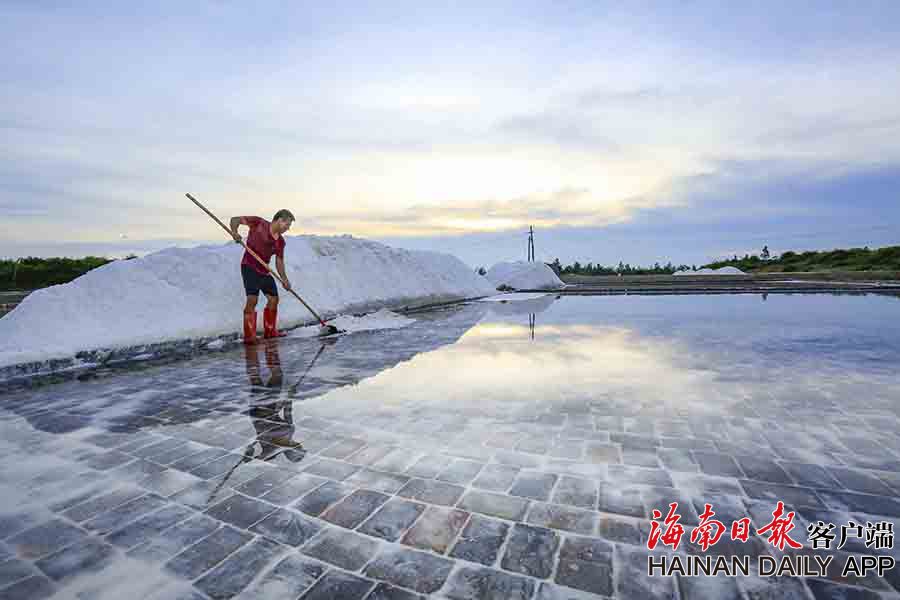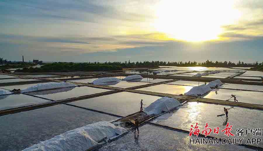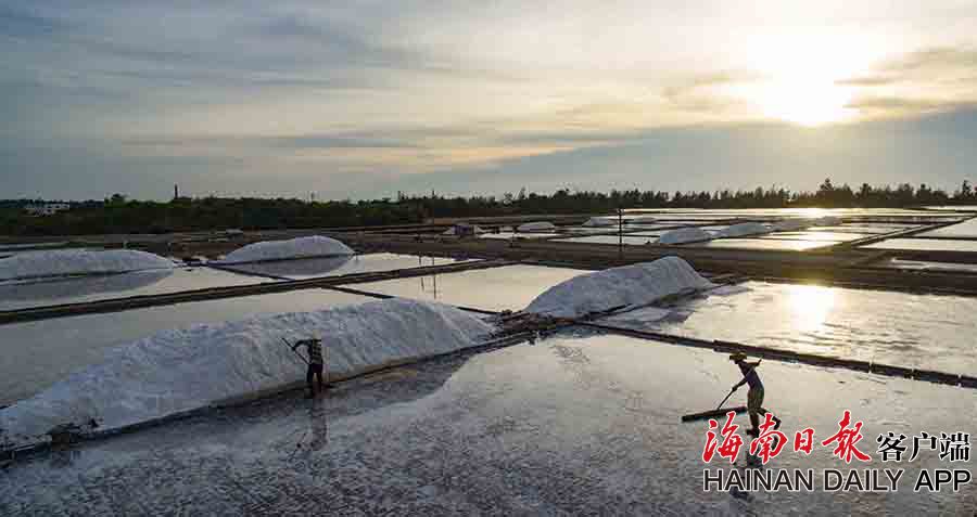 7月14日,在海南省東方市東方鹽場,鹽工們忙著曬鹽收鹽。時下正值曬鹽旺季,日落鹽場收鹽成為美景,吸引影友和游人拍攝參觀。海南日報記者陳元才 見習記者李天平 攝