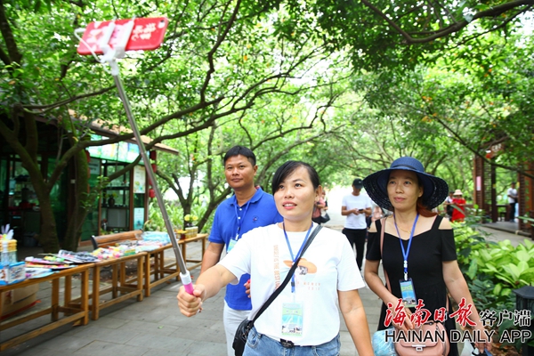 2019年7月18日,在??隈T塘綠園,游客在橄欖樹下開心合影。海南日報記者張茂 攝