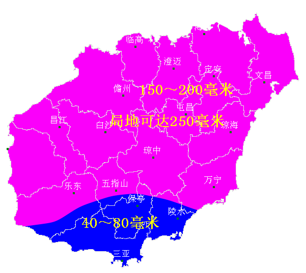預計,7月30日20時~8月2日08時,各地過程雨量:??凇⑴R高、澄邁、定安、屯昌、文昌、瓊海、萬寧、儋州、白沙、昌江、東方、瓊中、五指山和樂東等市縣150~200毫米,局地250毫米;陵水、保亭和三亞等市縣40~80毫米。