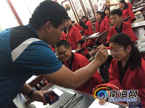 南海網(wǎng)小記者北京逐夢(mèng)研學(xué)營(yíng)老師給營(yíng)員點(diǎn)額間朱砂。南海網(wǎng)記者 林鴻羽 攝
