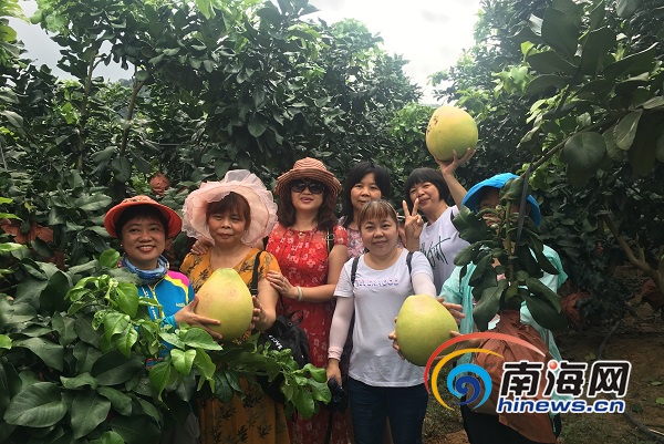 只九村金果樂基地負責人介紹道:“目前在只九村我們有1100畝種植基地,現在游客采摘的是獨具特色的‘樂東三紅柚’,今年掛果較往年稍晚一些,但也是大豐收。”