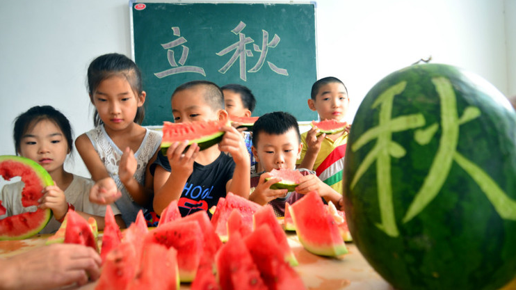 民間有在“立秋”這一天全家一起吃西瓜的習俗,稱之為“啃秋”。一些老人說,過了這一天,就不能再吃西瓜了。因此,人們在立秋當日買個西瓜回家,全家圍著啃,就是啃秋了。啃秋抒發的,實際上是一種豐收的喜悅。