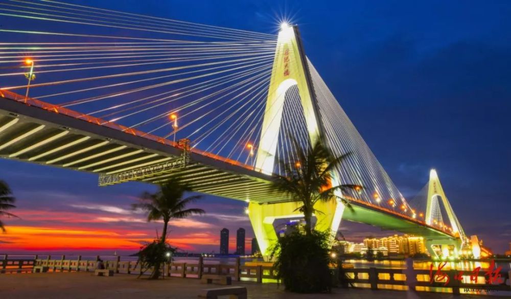 ↑夜色下的世紀大橋燈光璀璨、光芒交織。海口日報記者 蘇弼坤 攝