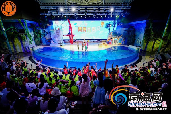 8月16日上午,2019海南南部地區困境(留守)兒童夏令營正式落下帷幕。孩子們在海昌不夜城看海豚表演。 三亞市民政局供圖