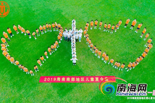 8月16日上午,2019海南南部地區困境(留守)兒童夏令營正式落下帷幕。孩子們正在航拍留影。 三亞市民政局供圖