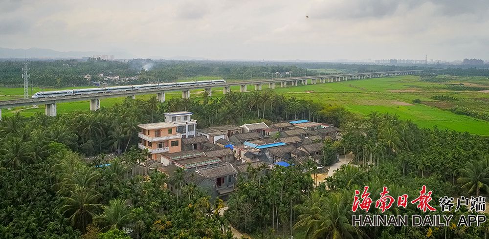 一列環島高鐵列車在瓊海的農田和村落駛過。海南日報記者 袁琛 攝