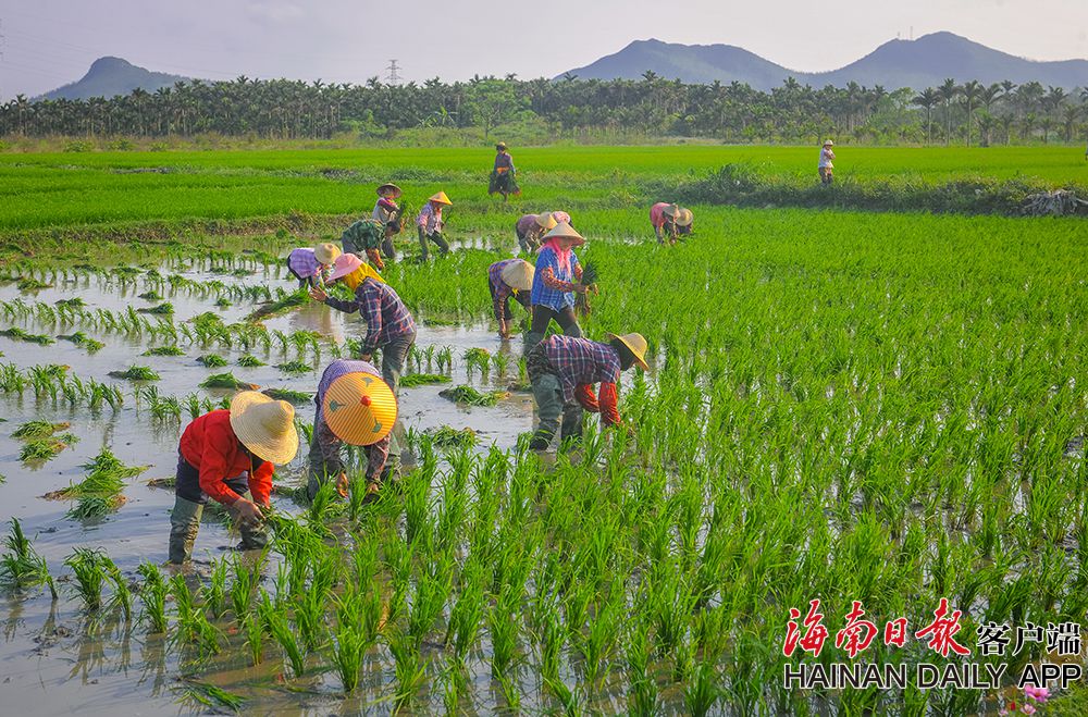 瓊海博鰲,農戶正抓緊有利天氣在稻田里忙插秧,播種新希望。海南日報記者 袁琛 攝