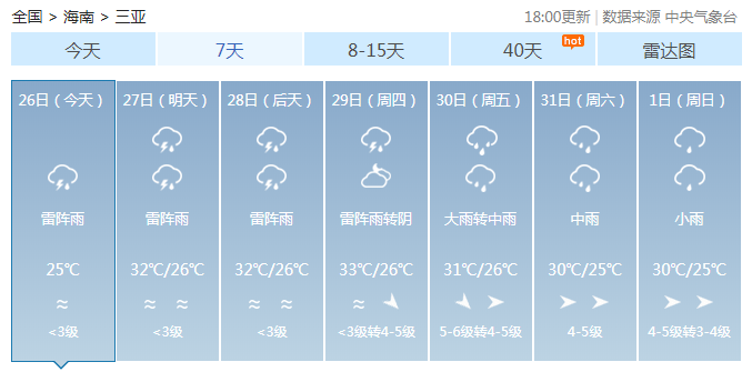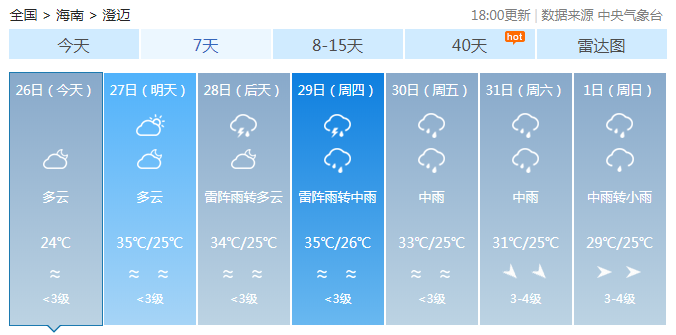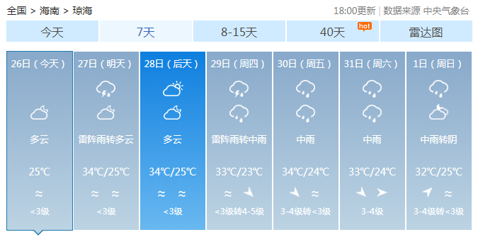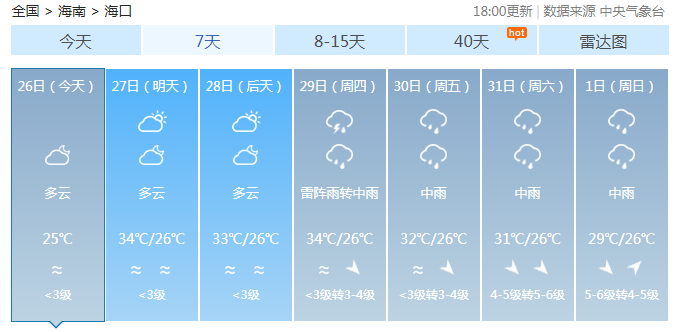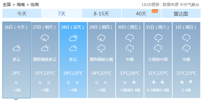 海南省氣象局預計,8月26日~29日,全島以多云天氣為主,局地有雷陣雨;8月30日~9月1日,受熱帶氣旋影響,海南島陸地和近海將有一次強風雨天氣過程。