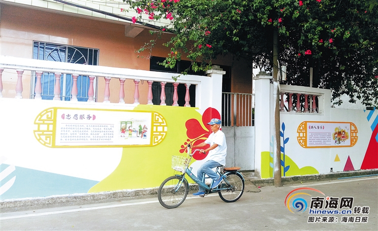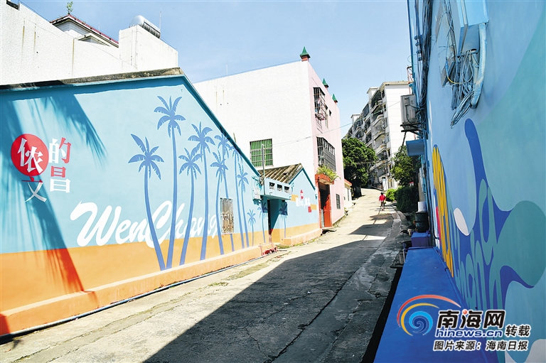 8月26日,海南日報記者在文昌市文城鎮(zhèn)看到,文城老城區(qū)原本老舊的墻體已被噴涂精美圖畫和宣傳正能量的文字,化身文藝范兒,洋溢著煥然一新的活力。