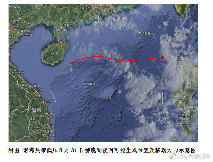 據(jù)監(jiān)測(cè),目前位于巴士海峽附近海面的熱帶云團(tuán)快速向偏西方向移動(dòng),將于今天(8月31日)傍晚到夜間進(jìn)入南海東部海面,并可能加強(qiáng)為熱帶低壓,低壓生成后將以每小時(shí)25公里左右的速度向偏西方向移動(dòng),可能于9月1日加強(qiáng)為今年第13號(hào)臺(tái)風(fēng)(熱帶風(fēng)暴級(jí)),2日逐漸向海南島東部沿海靠近,3~5日,該熱帶氣旋仍可能在海南島近海回旋,將給海南省帶來(lái)長(zhǎng)時(shí)間的風(fēng)雨天氣。