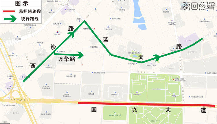 (四)如國興大道交通流量大,途經(jīng)駕駛?cè)丝蛇x擇繞行西沙路→萬華路→藍天路進入國興大道周邊區(qū)域。