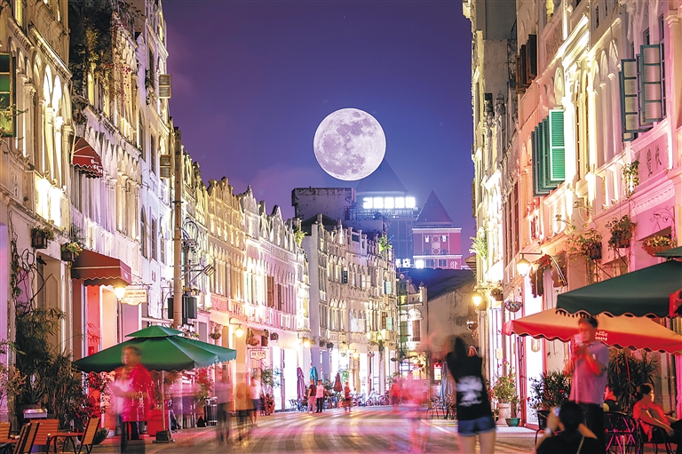 在海口騎樓老街賞月別有一番風味。海南日報記者袁琛攝