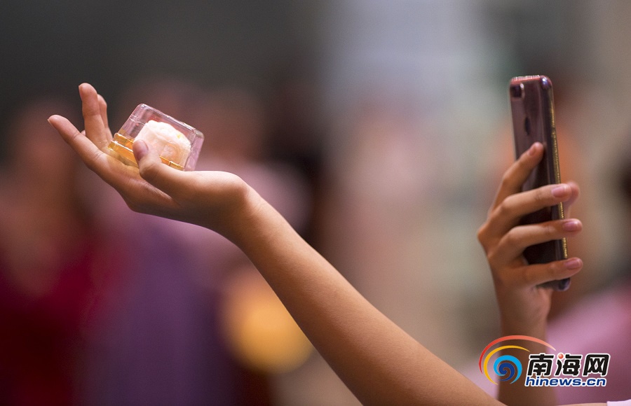 一位市民游客用手機(jī)拍攝自己制作完成的月餅。海報集團(tuán)全媒體中心記者 宋國強(qiáng) 攝