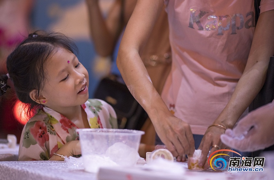 一位小朋友與家人參與“匠心品月”月餅制作。海報集團(tuán)全媒體中心記者 宋國強(qiáng) 攝