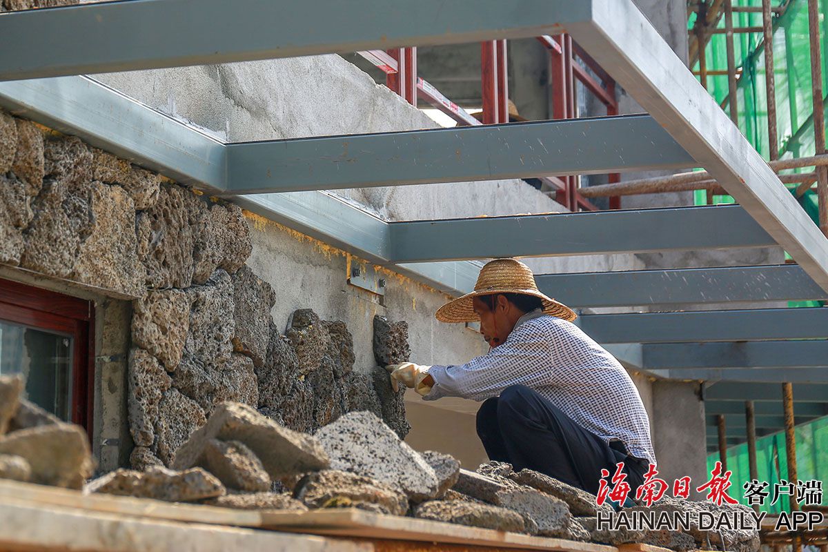 連日來,海口市瓊山區紅城湖公園加緊建設,紅城湖沿岸各個施工段同時施工。紅城湖公園南岸的施工建設尤其緊湊,樹木加固、土方平整、電線安裝等工作同步推進,力爭國慶節期間向市民功能性開放。據了解,海口紅城湖公園定位為綜合公園,此次改造將建設休閑廣場、環湖健身跑步道、散步道、濱水棧道等,實現重構紅城湖濱水景觀、增加生態系統多樣性、人與自然和諧共生的目標。 圖為9月15日,在海口紅城湖公園南岸工地,工人為墻體外立面貼上火山石。海南日報見習記者 李天平 攝