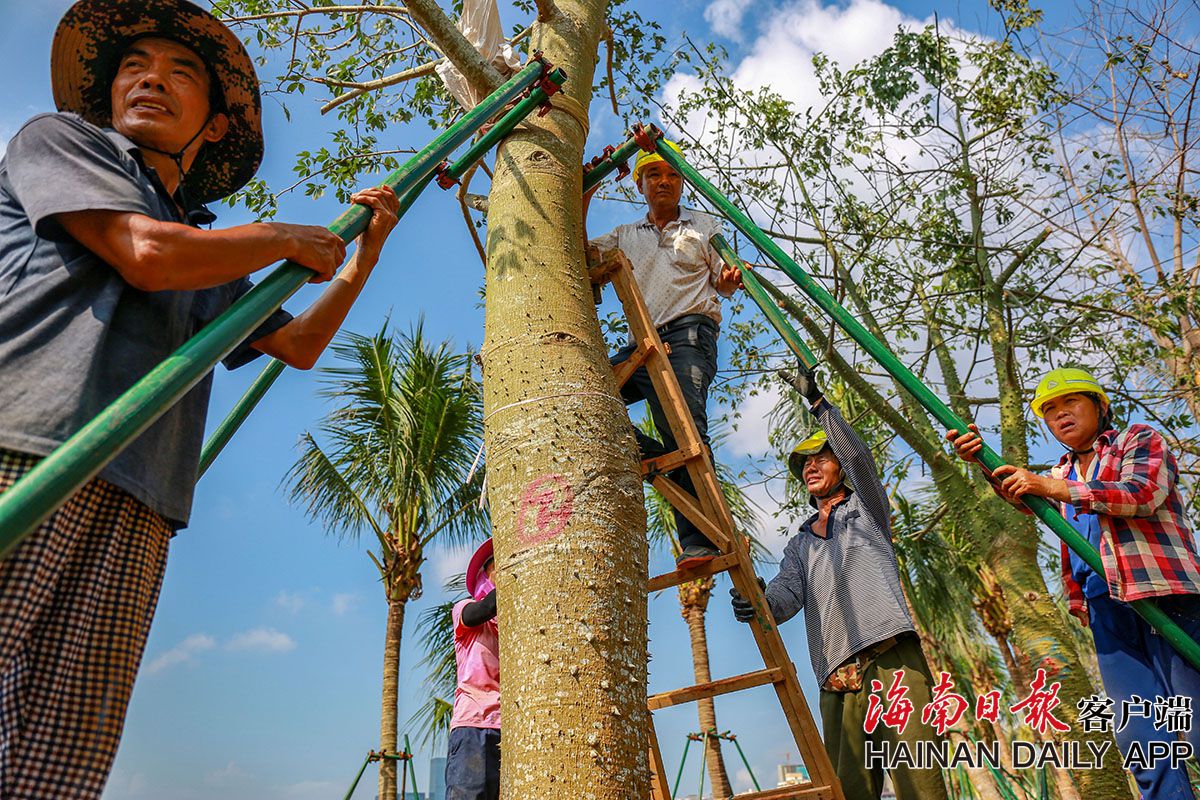 9月15日,在海口紅城湖公園南岸工地,工人用鋼管加固新種植的樹木。海南日報見習記者 李天平 攝