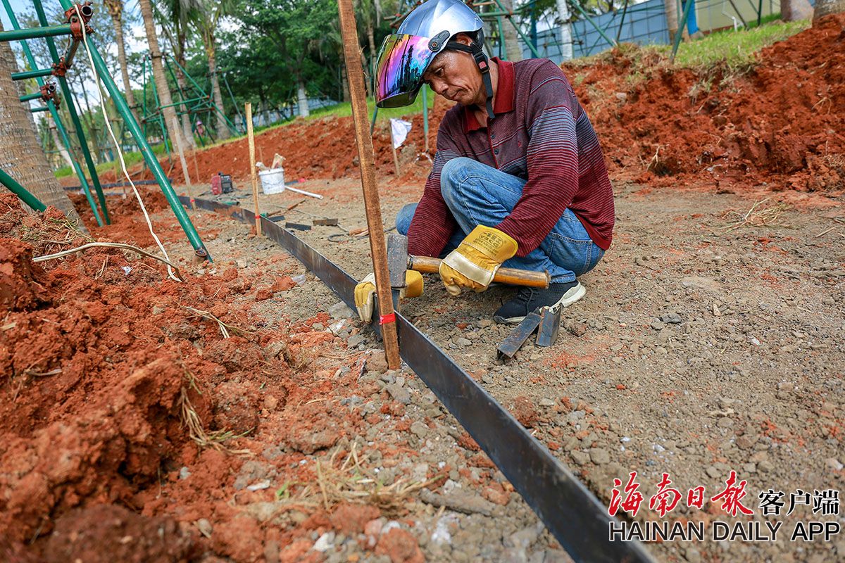 9月15日,在海口紅城湖公園南岸工地,工人加固鋼板確定步道范圍。海南日報見習記者 李天平 攝