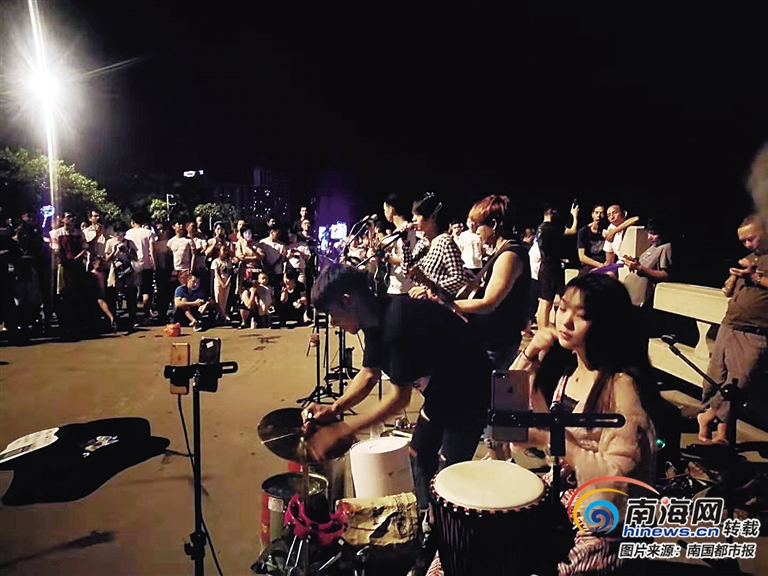 如今在海口灣,除了這支樂隊外,還有其他的歌者和演出團體,他們的出現,讓海口灣的夜晚變得越加熱鬧。也因為他們的出現,人們在網絡中提到海口灣時,就會想到那里有街頭演出,想到油漆桶樂隊。