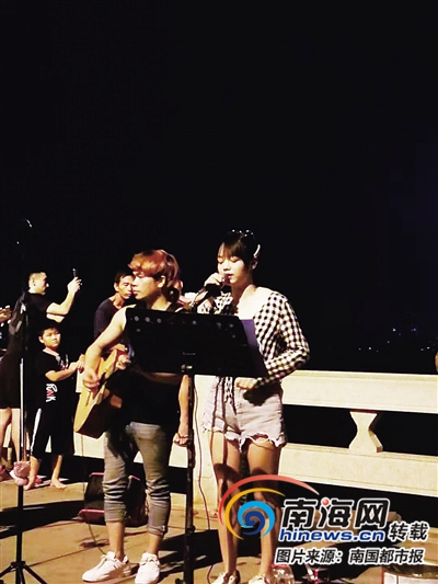 “盛夏海邊的夕陽,撫慰著我心頭,沒有冬天的小城里,我從未忘記你……”街頭歌手小憶演唱著海口版的《成都》,在圍觀的人群中,有的席地而坐,開啟手機的手電筒,陶醉地隨著音樂節奏揮舞著。