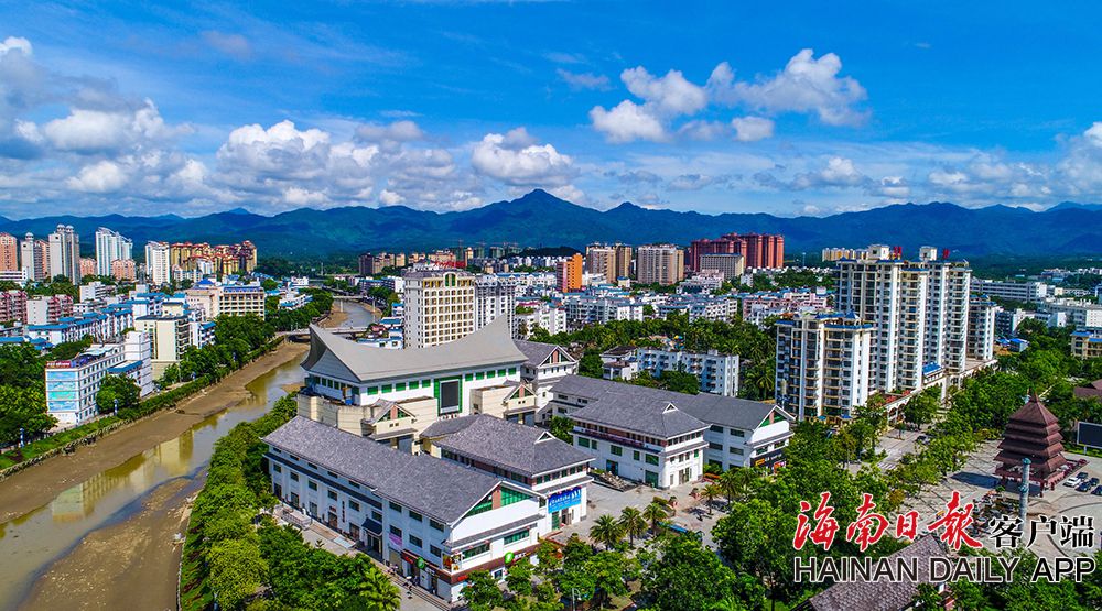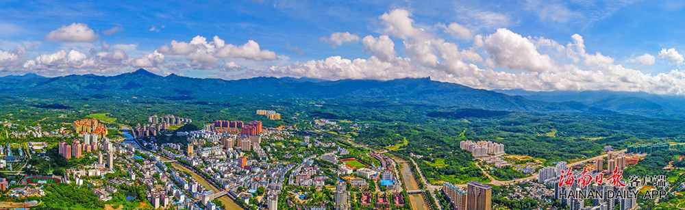 藍(lán)天白云下,高空航拍在保亭黎族苗族自治縣縣城全貌,遠(yuǎn)處的七仙嶺景色迷人。海南日?qǐng)?bào)記者 張茂 攝