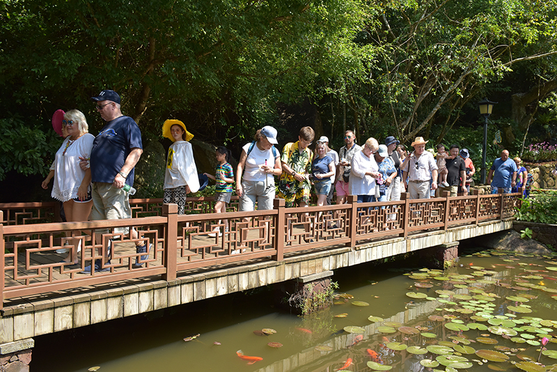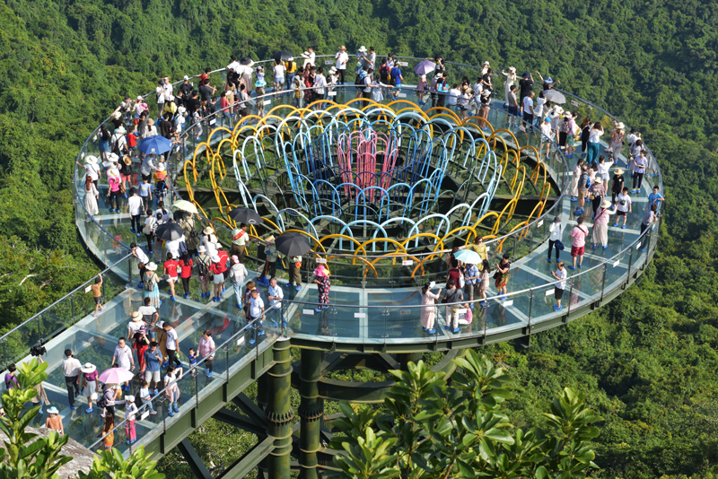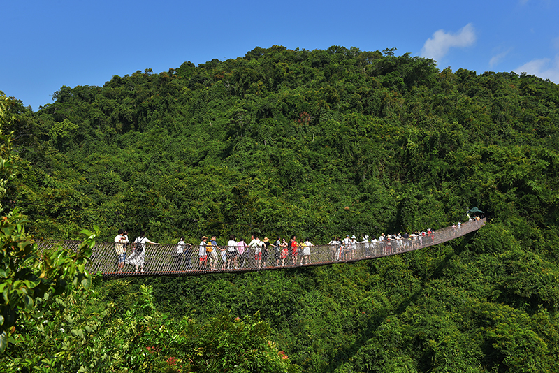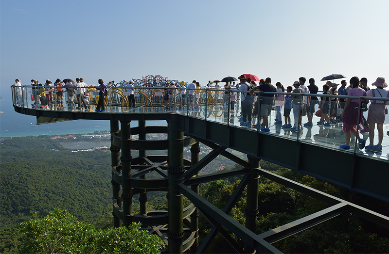 中外游客愉快地在三亞亞龍灣熱帶天堂森林旅游區賞花觀景,登高望遠,領略亞龍灣熱帶天堂十月金秋的美麗風光。該景區熱門景點過江龍索橋和全海景玻璃棧橋,成為眾多游客體驗游覽打卡之地。