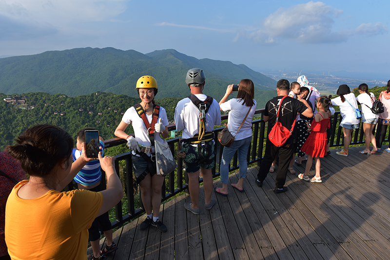 10月4日,國慶長假期間,中外游客激情暢游三亞亞龍灣熱帶天堂森林旅游區的情景。(黃慶優攝)