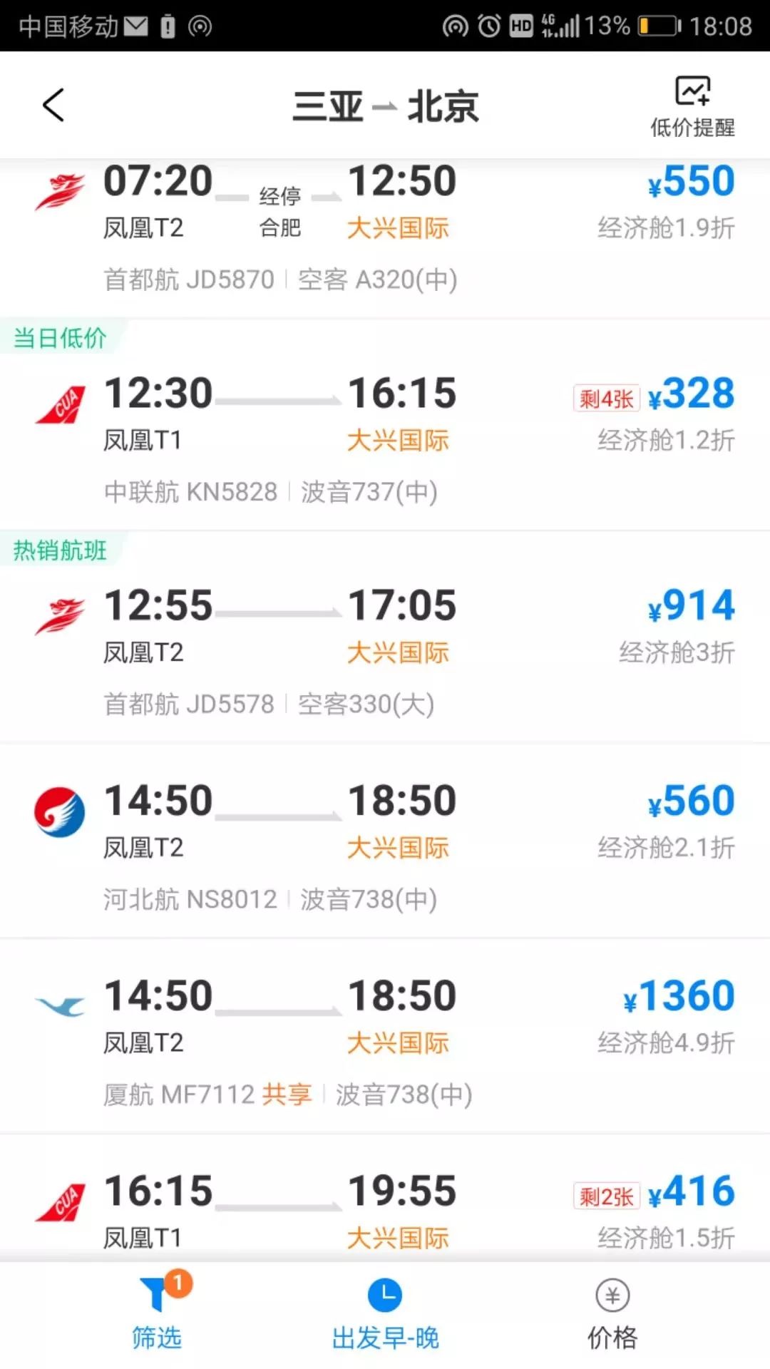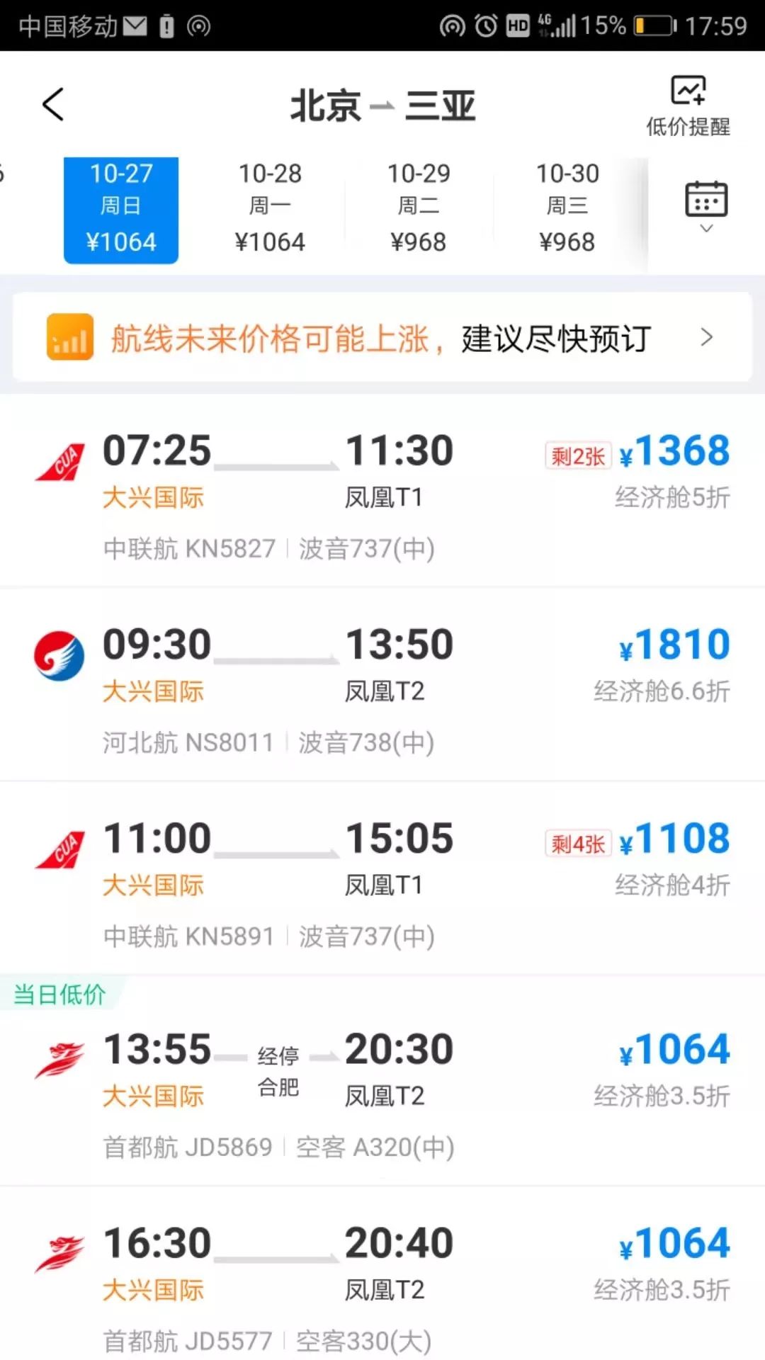 記者今日18時查詢發現,其中10月27日當天,從北京大興國際機場飛三亞的經濟艙票價最便宜是1064元,機票價3.5折,經濟艙全價2780元。而三亞飛北京大興國際機場10月底到11月份有大量2折以下的特價機票。比如,11月1日飛北京大興國際機場的5個航班中,多個航班的機票不到2折,最低300元左右可前往北京。