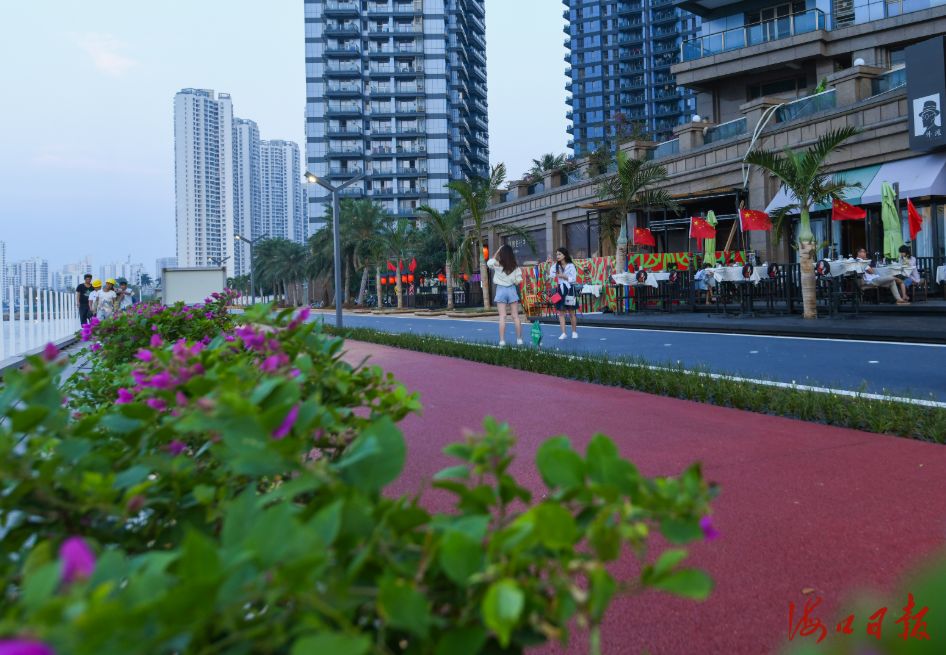 在海口灣,越來越多的濱水區域,從封閉割裂的“隱藏”地段,逐漸蛻變為整潔的休閑長廊,成為市民喜愛的海景大公園。記者探訪發現,騎行道、跑道、漫步道涇渭分明,道面分別用黑色、紅色、灰色呈現。其中,寬度略有不同,騎行道更寬,達4米,其余為3米。