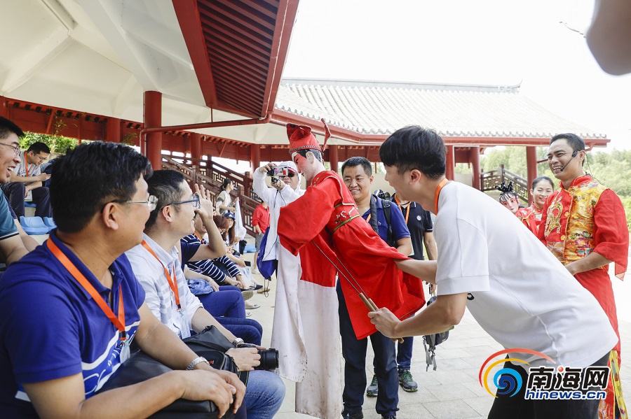 臨高縣文化藝術(shù)中心演員現(xiàn)場教采訪團(tuán)成員表演臨高人偶戲。南海網(wǎng)記者 李昊 攝