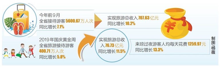 2018年以來,海南以推進自貿(mào)區(qū)、自貿(mào)港建設為主線,以國際旅游消費中心建設為抓手,旅游經(jīng)濟發(fā)展質量效益顯著提升。今年1-9月,全省接待游客5600.67萬人次,同比增長7.1%,實現(xiàn)旅游總收入707.63億元,同比增長10.2%;2019年國慶黃金周,全省旅游接待游客400.71萬人次,同比增長5.8%,實現(xiàn)旅游總收入76.73億元,同比增長11.5%,來瓊過夜游客人均每天花費1259.97元,同比增長13.3%。旅游收入增幅高于游客人數(shù)増幅,旅游消費水平顯著提高,我省旅游產(chǎn)業(yè)正在朝著高質量發(fā)展邁進。