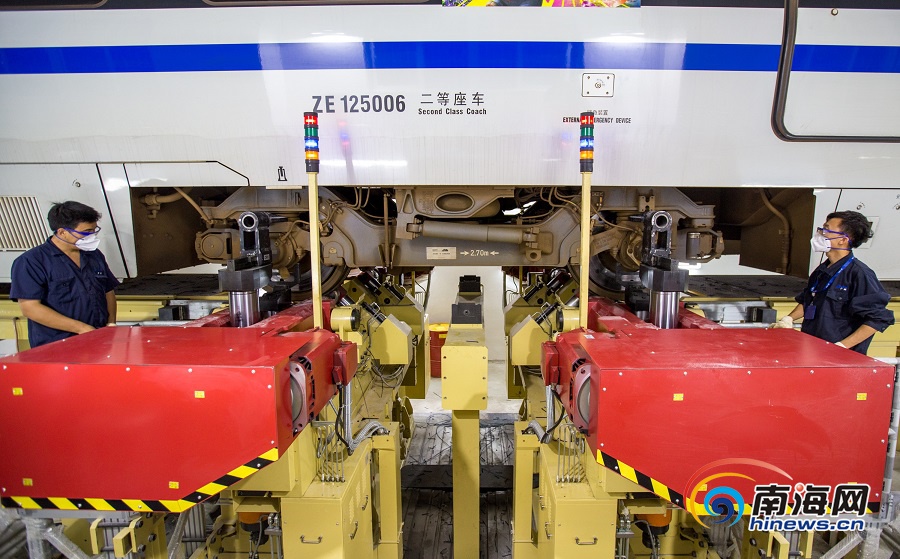 2019年01月19日三亞 提質(zhì)增效 保安全 迎春運(yùn) 1月19日晚,工作人員在鏇輪車(chē)庫(kù),操作雙軸不落輪鏇床,進(jìn)行動(dòng)車(chē)組輪對(duì)踏面鏇修。 據(jù)悉,今年1月21日進(jìn)入春運(yùn),春運(yùn)期間海南環(huán)島高鐵線預(yù)計(jì)發(fā)送旅客436萬(wàn)人,日均發(fā)送10.9萬(wàn)人,最高峰時(shí)將使用20組動(dòng)車(chē)組滿圖開(kāi)行58對(duì)。 為提質(zhì)增效,有力保障春運(yùn)安全,廣州動(dòng)車(chē)段三亞動(dòng)車(chē)運(yùn)用所經(jīng)過(guò)近半年的安裝調(diào)試,將雙軸不落輪鏇床投入使用,把動(dòng)車(chē)組輪對(duì)踏面鏇修的工作效率提高一倍,工時(shí)由原來(lái)的48小時(shí)/組提升到24小時(shí)/組。 他們正在做好動(dòng)車(chē)組各項(xiàng)系統(tǒng)的春運(yùn)前普查、檢修,確保車(chē)組在春運(yùn)期間的安全運(yùn)行;并制定應(yīng)急預(yù)案,成立小分隊(duì),確保線上發(fā)生故障及時(shí)處置。全所干部職工春運(yùn)期間全員在崗,確保動(dòng)車(chē)所各項(xiàng)工作的有序進(jìn)行。