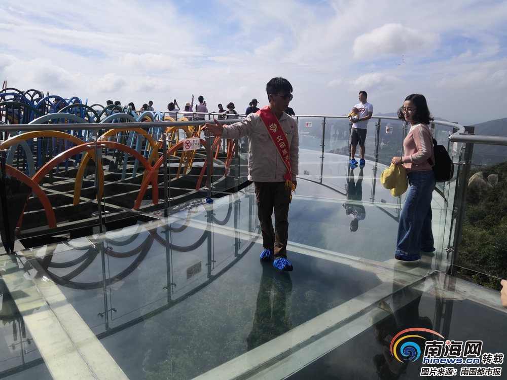 在三亞亞龍灣熱帶天堂森林公園內,網紅玻璃棧道上的文明引導員正在引導游客有序游玩。