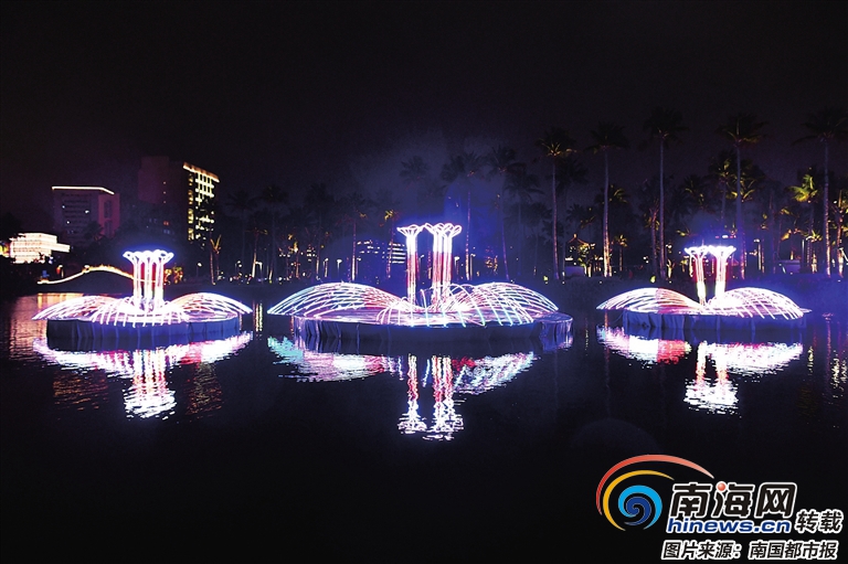 1月5日,記者在現場看到,這些彩燈造型多樣,色彩豐富,尤其是水面上的幾組,平靜的湖面上的倒影很出彩。記者在現場拍攝時,游客王先生正在給妻子拍照。他說:“海口越來越漂亮了。”