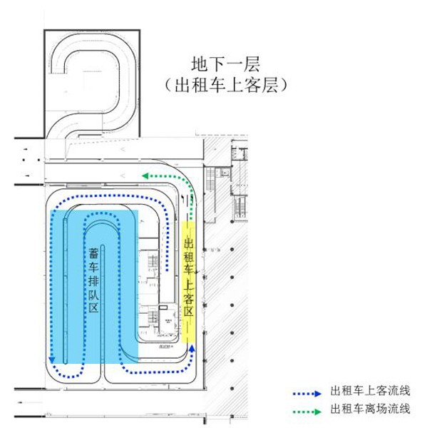 出租車離場時,沿離場通道行駛,通過海汽客運總站地下車場出口離場。
