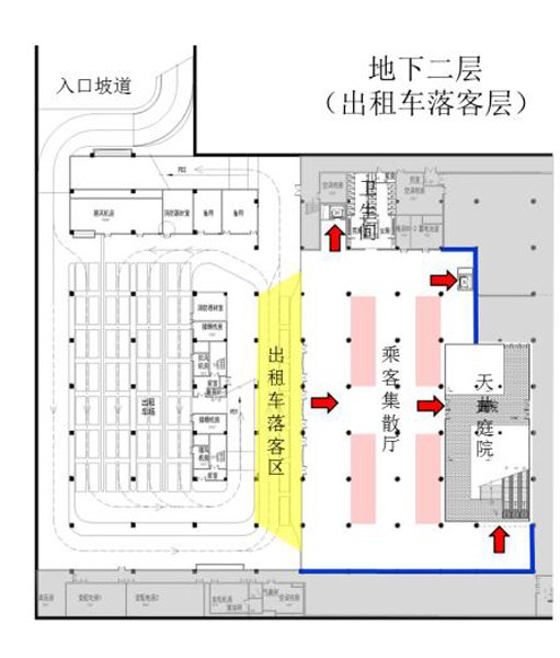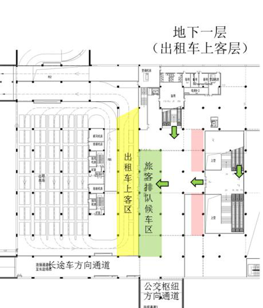 前往海汽客運總站的出租車和從海汽客運總站地下車場入口駛入,在地下車場落客后待客或直接離場,旅客下車后通過地下通道出口到達海汽客運總站地面廣場。