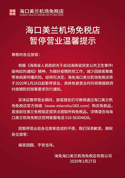海南旅游頭條、南海網、南海網客戶端海口1月27日消息(南海網記者 劉洋)1月27日晚,南海網記者從海口美蘭機場免稅店獲悉,海口美蘭機場免稅店將于2020年1月28日起暫停營業(yè),具體恢復營業(yè)時間將根據(jù)政府對疫情防 控部署要求另行通知。實體店暫停營業(yè)期間,出島旅客可通過海口美蘭機場免稅店官方商城購買免稅品,前往美蘭免稅指定提貨點提取所購免稅品。