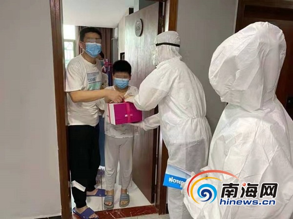 在日常巡查中,美蘭區(qū)健康管理服務(wù)中心的工作人員得知,方先生10歲的兒子和他太太的生日都在正月初九,便主動(dòng)購買了生日蛋糕送到方先生的房間,為其太太和兒子慶祝生日。“中午12點(diǎn)左右,我們?nèi)ズ?谑腥〉案猓?點(diǎn)多送到方先生房間。”演豐鎮(zhèn)鎮(zhèn)委委員李慧蘭說,因海口大多數(shù)商店仍處在歇業(yè)狀態(tài),工作人員們連跑數(shù)家蛋糕店,才訂到了生日蛋糕。 “真的太感謝了!”看到工作人員送上來的蛋糕,方先生感到十分驚喜,連連道謝,并表示美蘭區(qū)的服務(wù)“有溫度,很感動(dòng)。”