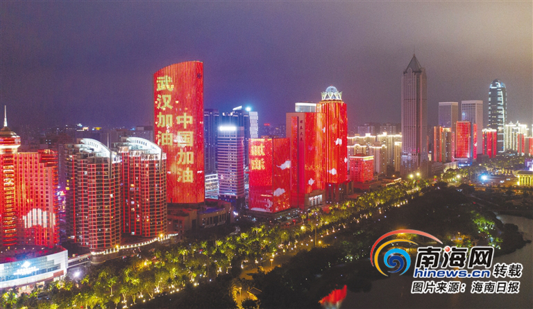 新冠肺炎疫情牽動著每一位中國人的心。2月8日,正值元宵佳節(jié),???、三亞一些街道的樓體上亮起主題燈光,為武漢加油,為中國加油!圖為2月8日晚,??谑袨I海大道點亮主題燈光。海報集團全媒體中心記者 陳若龍 攝