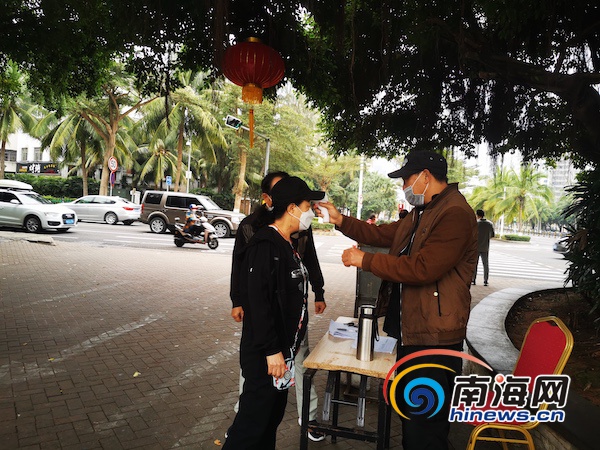 海口白沙門公園入口處,值班人員對入園市民進行體溫檢測。南海網記者 韓星 攝