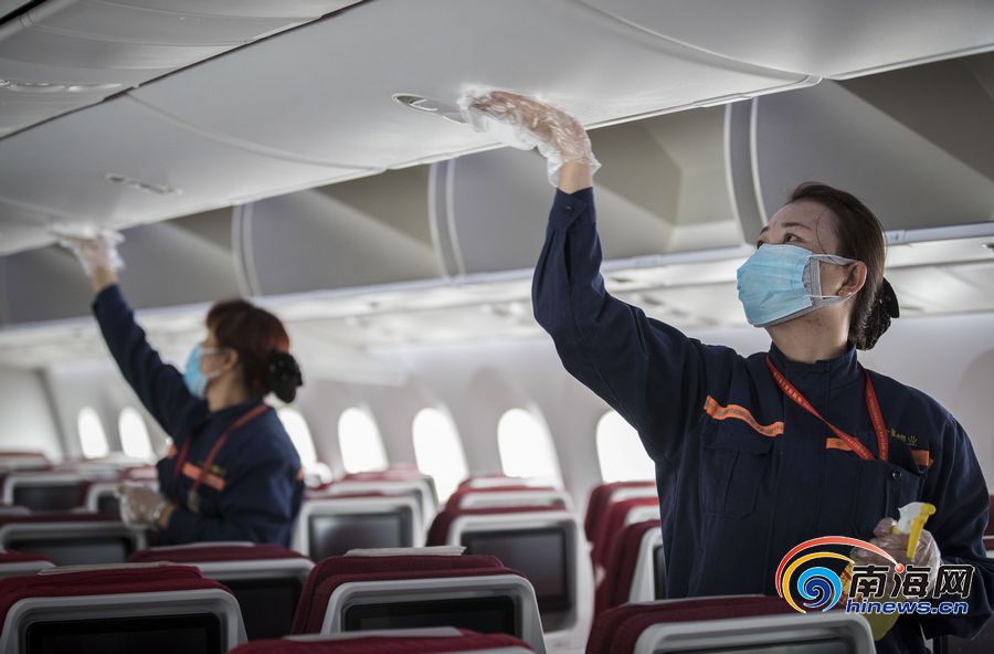 海南旅游頭條、南海網、南海網客戶端、南國都市報海口3月11日消息(記者 劉洋 通訊員 王彬宇)“航空器已消殺完畢,可以正常開始清潔保障”。在8名海航物業機上清潔隊隊員的配合下,不到15分鐘,一架超過300座A330機型的航班就完成了標準無死角的消殺和清潔。
