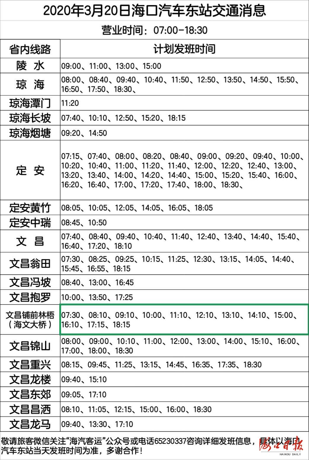 據介紹,??谄嚃|站主要負責省內東線客運,也可以聯網售省際班線車,由接送車免費接送。本次恢復營運后,??谄嚃|站車輛主要發往海南東線瓊海、定安、陵水及文昌支線鄉鎮線路。計劃每天132個班次。最早發班時間為7:00,最晚一班為18:30。