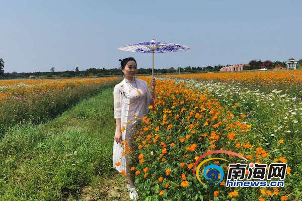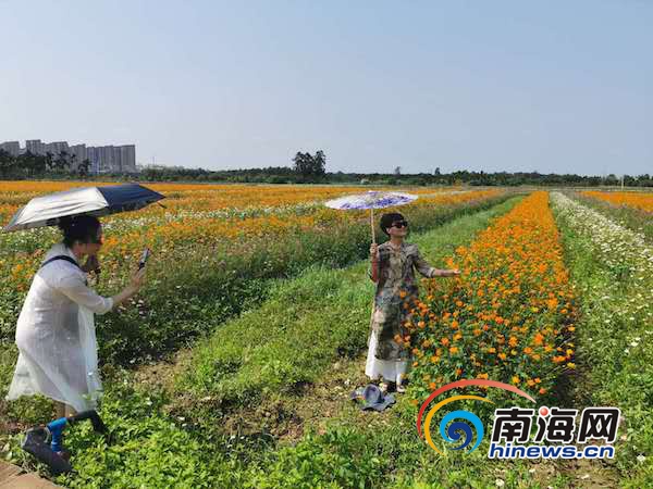 游客在瓊海龍壽洋萬畝田野公園花海內(nèi)拍照留念。記者韓星 攝