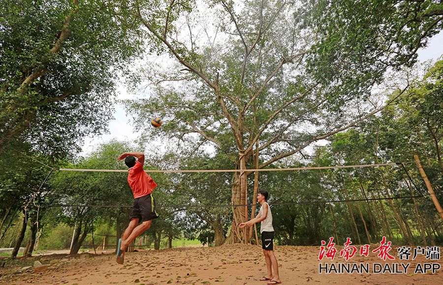 在儋州市大成鎮推賽村,村民在古樹下打排球。