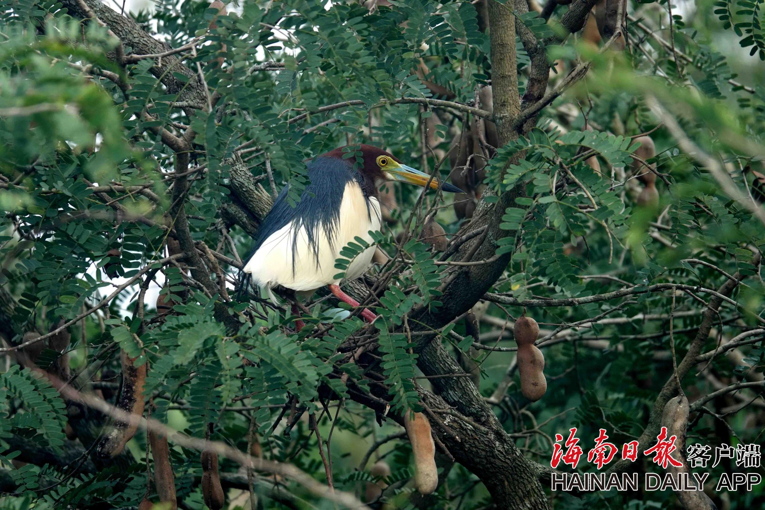 在儋州市大成鎮推賽村,一只鳥在酸梅古樹上棲息。